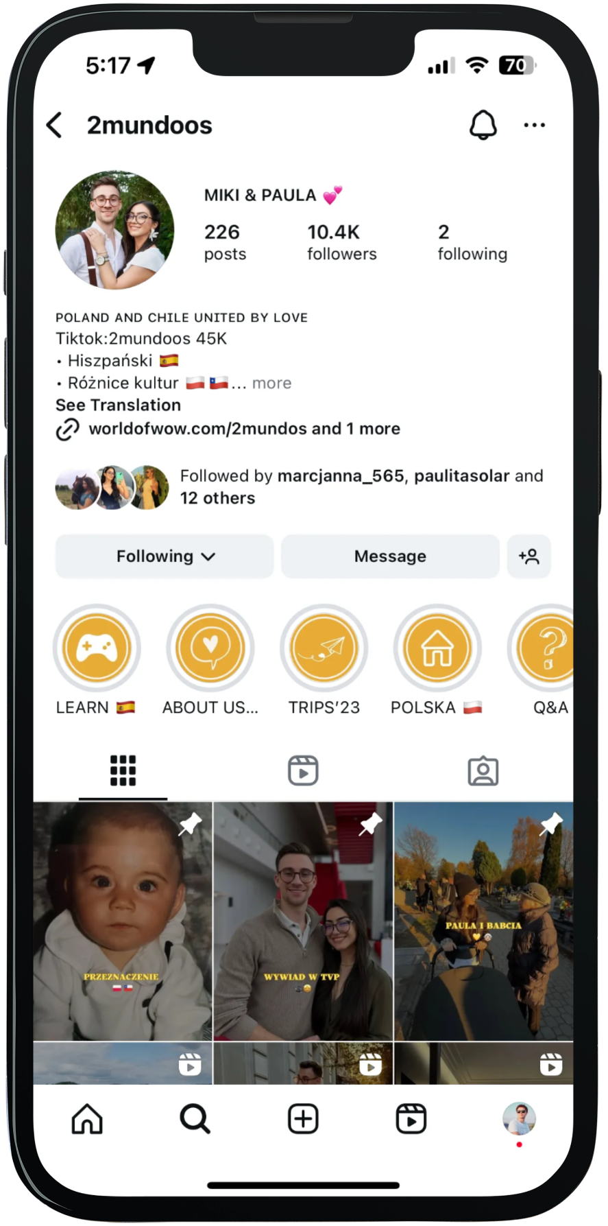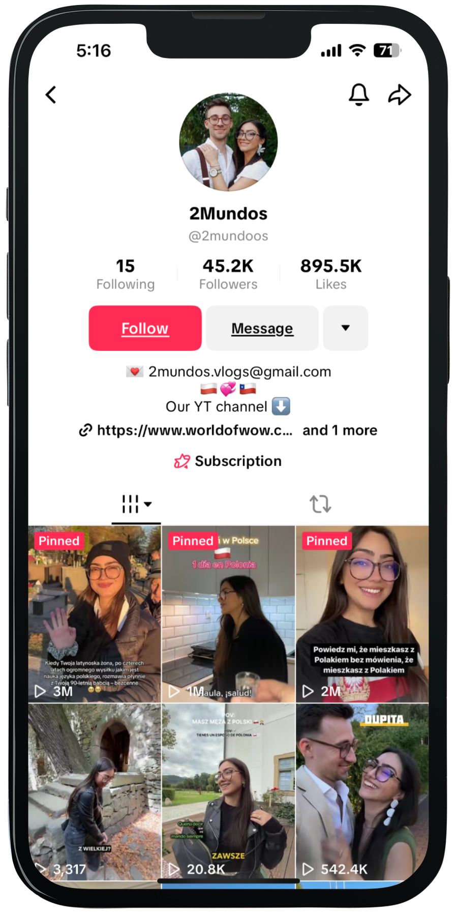 W naszych social media dzielimy się miłością, pozytywną energią i prawdziwymi emocjami. Na TikToku obserwuje nas 43 tys. osób, a na Instagramie 10 tys. Dla nas to nie liczby – to każda wyjątkowa osoba, która towarzyszy nam w codziennym życiu, w radosnych chwilach, ale też w trudnych momentach. Razem z naszymi obserwującymi tworzymy wyjątkową społeczność 2Mundoos.